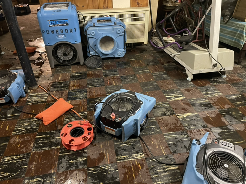 A Sewer back up in Holmdel, New Jersey, affected an unfinished basement, leaving it’s concrete and hardwood floor completely wet and covered with waste. Project Manager Tom inspected the affected area, and then upon communicating the scope of the work with the homeowners, our team got to started on the job. Our technicians cleaned, disinfected, and installed thirteen air movers, two dehumidifiers, and two air scrubber to dry the basement.