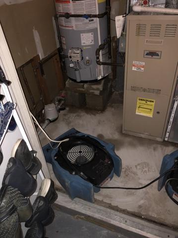 This home in Somerset, New Jersey, experienced a water heater leak. The failed water heater affected the drywall, moldings, structural softwood, concrete, and insulation in 4 rooms of the home. Northeast Power Dry project manager, Angelo, was sent in to evaluate the damage. Angelo decided the best plan of action would be to have our crew remove the damaged carpet, moldings, and drywall and install 6 fans and 2 dehumidifiers to dry the remaining areas.